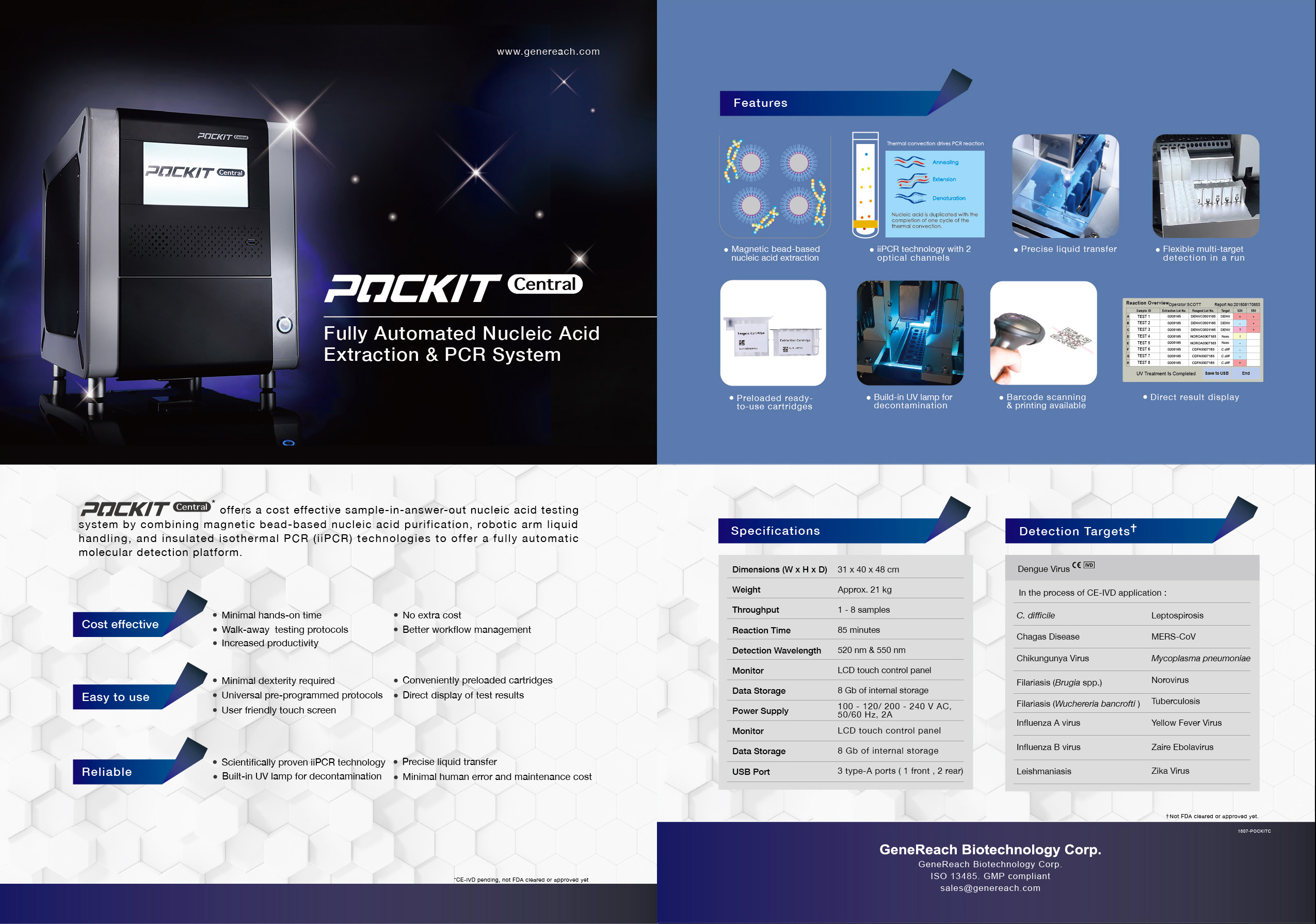 POCKIT™ Central核酸分析仪是一台一体式核酸检测系统,集成了基于自动磁珠的核酸提取,机械臂液体转移和恒温热隔绝式PCR(iiPCR)技术,只需要加入样品就可得到结果,可提供完整的自动核酸检测平台。